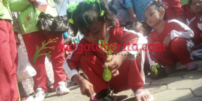 WAGATABERITA.COM – JEMBER. Ribuan siswa – siswi dari 51 Paud Kecamatan Puger Kabupaten Jember Jawa Timur, tumpah di alun – alun kecamatan setempat, guna mengikuti kegiatan penanaman pohon berbuah dalam Poliback Minggu (23/04/2017).