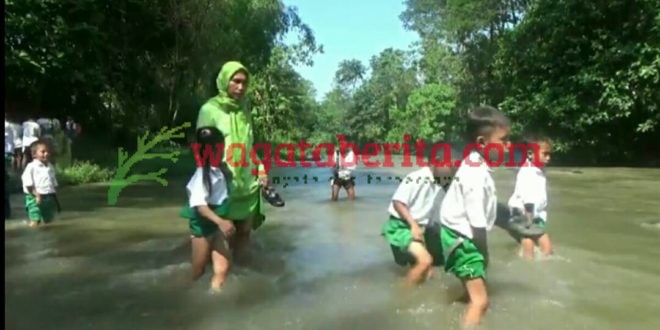 Puluhan siswa sekolah Raudlatul Atfal dan Madrasah Diniyah Nurul islam, harus rela bertaruh nyawa melawan derasnya aliran sungai Rondoningo, yang memiliki lebar 15 meter itu.