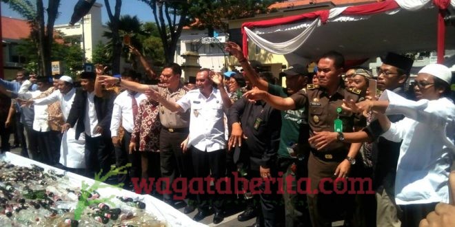 WAGATABERITA.COM – SURABAYA. Jajaran Polrestabes Surabaya memusnahkan barang bukti berupa minuman keras (miras) dan narkoba, Rabu (24/05/2017).