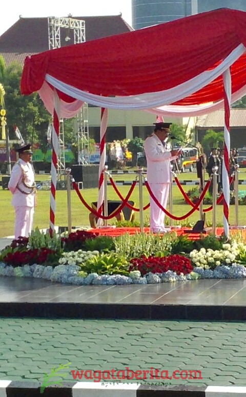 Gubernur Jatim Dr.H.Soekarwo Saat Membacakan Amanat Presiden Jokowi Dalam Rangka Peringatan HUT Bhayangkara Ke 71 Di Halaman Mapolda Jatim, Senin (10/07/2017) Pagi. Sumber Foto : Endri Soedarto