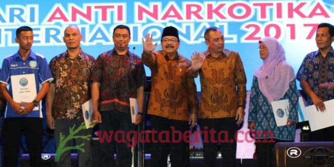 WAGATABERITA.COM – SURABAYA. Gubernur Jawa Timur, Dr. H. Soekarwo menggelorakan semangat anti narkoba di hadapan puluhan ribu siswa – siswi sekolah, anggota Forum Koordinasi Pimpinan Daerah (Forkopimda), serta masyarakat dalam Peringatan Hari Anti Narkotika Internasional (HANI) Tahun 2017 di Halaman Makodam V/Brawijaya, Kamis (13/07/2017) malam.