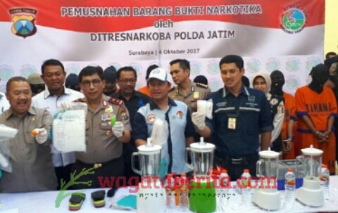Dalam pemusnahan ini, selain Kapolda Jatim, juga dihadiri Kepala Kejati Jatim Maruli Hutagalung serta pejabat dari kantor imigrasi kelas I Surabaya Waru, kantor bea cukai Juanda, hingga dari lanudal. (Endri Soedarto/Halu)