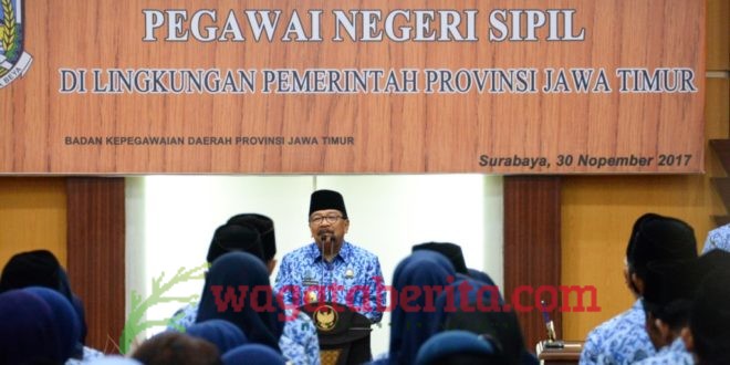 WAGATABERITA.COM – SURABAYA. Gubernur Jawa Timur H. Soekarwo mengingatkan kepada pegawai negeri sipil (PNS) di lingkup Pemprov Jatim dalam menjalankan tugasnya selalu berdasarkan Pancasila dan Undang Undang Dasar/UUD 1945. Selain taat pada Pancasila dan UUD 1945, PNS juga harus mengabdi untuk kepentingan pemerintah dan negara.