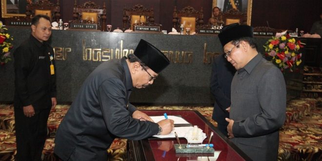 Gubernur Jatim Soekarwo (Kiri) Bersama Ketua DPRD Jatim H. Halim Iskandar Menandatangani Perda Pemanatauan Orang Asing Yang Telah Mendapat Persetujuan Dewan. Sumber Foto : Humas Pemprov Jatim
