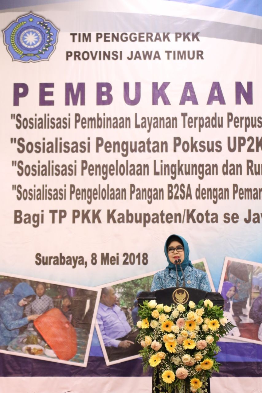 WAGATABERITA.COM – SURABAYA. Bude Karwo sapaan lekat Ketua TP PKK Provinsi Jatim membuka Pelaksanaan Program Pokja II dan III TP PKK Provinsi Jatim di Hotel Oval, Surabaya, Selasa (08/05/2018).