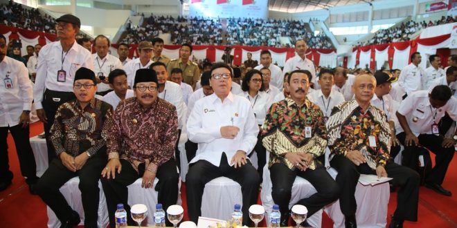WAGATABERITA.COM – MALANG. Selain Gubernur Jawa Timur Dr. H. Soekarwo, ikut hadir Mendagri Tjahjo Kumolo pada acara Sarasehan Peningkatan Kapasitas Aparatur Pemerintahan Desa dan Lembaga Kemasyarakatan Desa Wilayah Kerja Balai Besar Pemerintahan Desa di Gor Ken Arok Kota Malang, Rabu (01/08/2018).