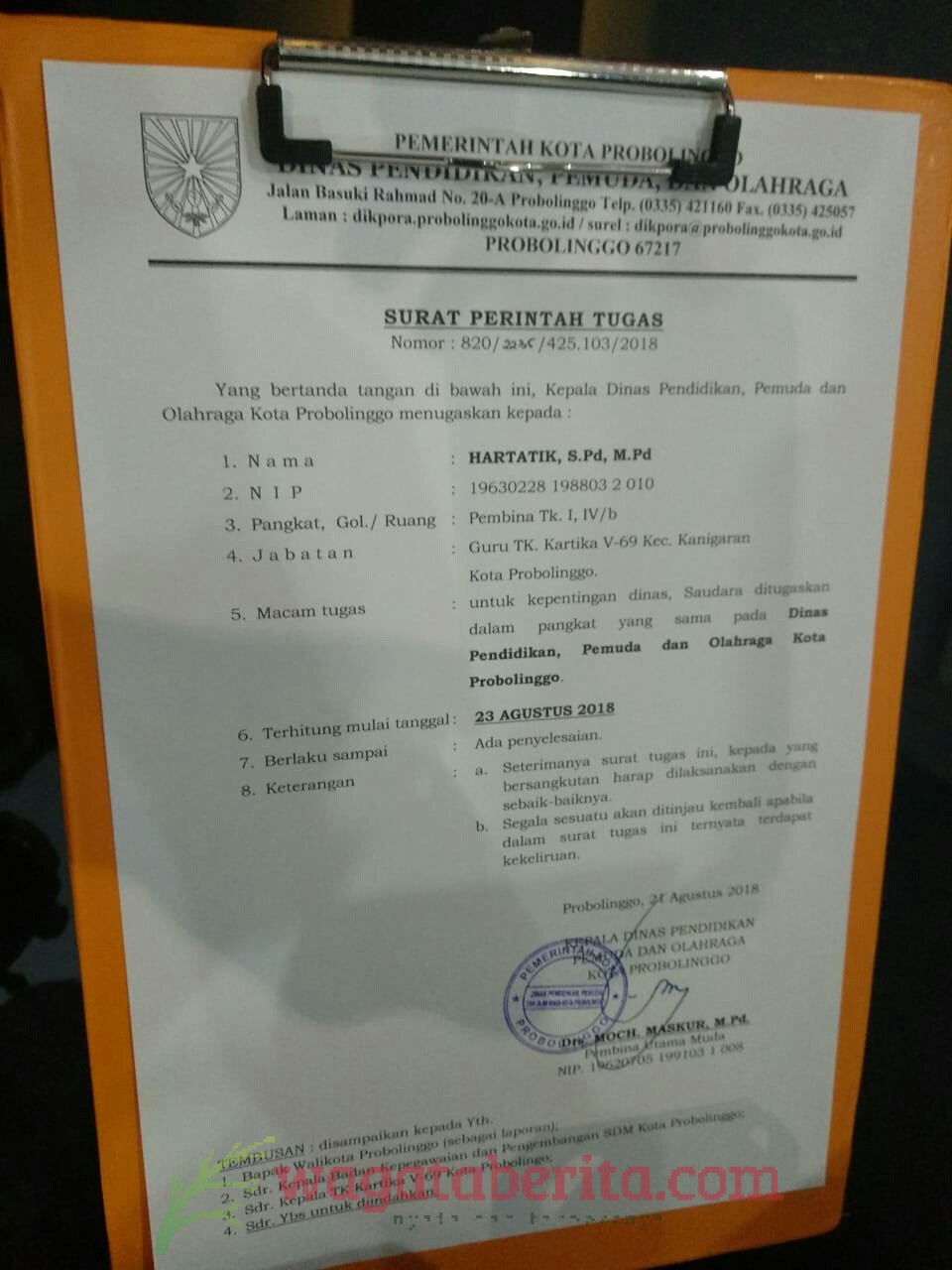 Kadisdikpora Kota Probolinggo Bersama Kasi TK SD, Menunjukkan Surat Pemindahan Tugas Kepsek TK Kartika.