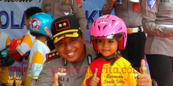 “Kita beri helm ini, agar anak – anak terhindar dari bahaya, saat ikut berkendara bersama orang tuanya,” kata Kapolres, Jum’at (21/09/2018).