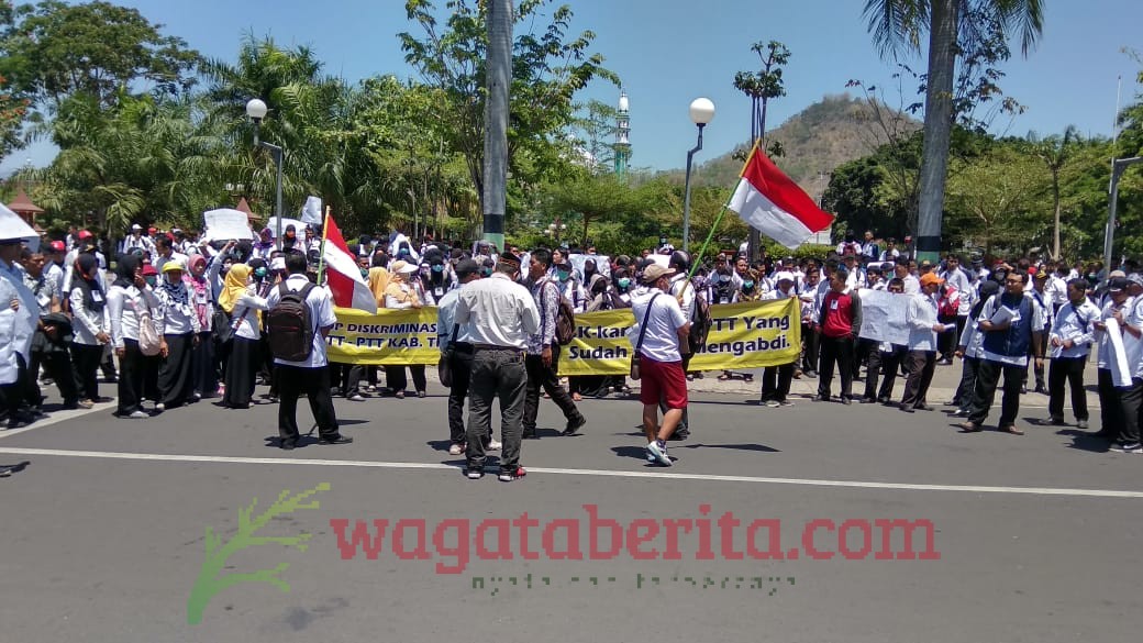 WAGATABERITA.COM – TRENGGALEK. Ribuan Guru Tidak Tetap (GTT) dan Pegawai Tidak Tetap (PTT) di Kota Keripik Tempe geruduk kantor Bupati Trenggalek. Ribuan guru dan pegawai yang tergabung dalam forum GTT dan PTT Sekolah Dasar Kabupaten Trenggalek ini menuntut kepada Pemerintah Daerah agar pengadaan tes Calon Pegawai Negeri Sipil (CPNS) ditiadakan.
