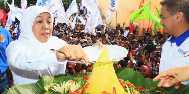 Gubernur Jawa Timur Khofifah Memotong Tumpeng di acara Mayday di Depan Kantor Jl. Pahlawan Surabaya.