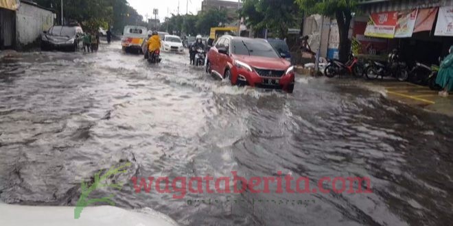 Pantauan tim wagataberita.com Kamis (04/03/2021) genangan banjir setinggi separuh ban sepeda motor cukup mengganggu kendaraan yang lewat khususnya roda dua.
