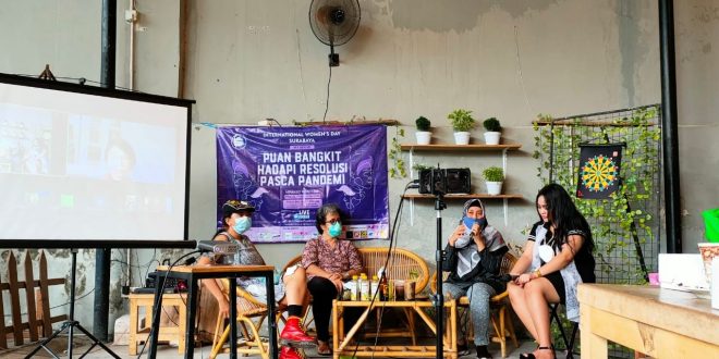 WAGATABERITA.COM – SURABAYA. Seminar dan webinar dengan tajuk ‘Puan Bangkit Hadapi Resolusi Pasca Pandemi’ diadakan panitia International Women’s Day dalam rangka peringatan Hari Perempuan Internasional dilaksanakan di Teras Belakang Rumah, Rungkut Surabaya dimana diikuti pula sekira 16p partisipan secara daring. Minggu, (07/03/2021).