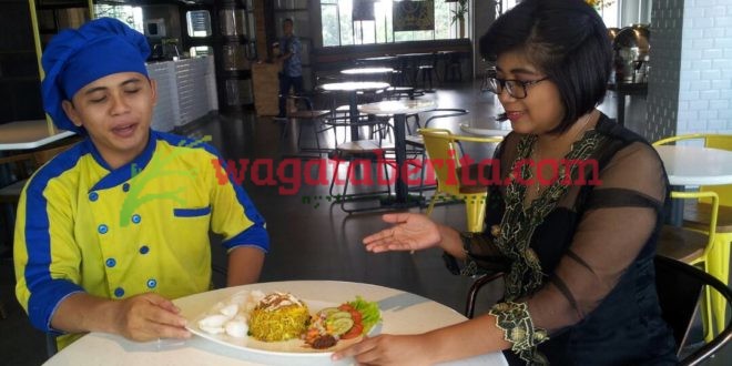 Chef (Koki) Yello Hotel Jemur Sari Surabaya Andreas (Kiri) Dan Debora Dea Augustha, Markom Leader Yello Hotel Jemur Sari (Kanan) Saat Memperlihatkan Kuliner Khas Nasi Goreng Ayam Kampung Jumat (21/04/2017). Sumber Foto : Haludin Ma'waledha