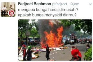 Di akun twiter resminya Fadjroel melakukan tweet “mengapa bunga harus dimusuhi? apakah bunga menyakiti dirimu?” Bahkan terpantau hingga 3 kali Fadjroel Melakukan tweet nya dengan berbeda komentar, walau begitu Fadjroel juga sempat mengucapkan “Selamat Hari Buruh Internasional 1 Mei 2017” melalui akun twiter nya. (Juliman)