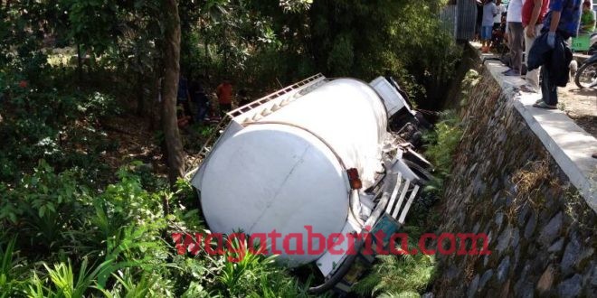 Jarak yang terlalu dekat, membuat 2 kendaraan itu pun terlibat adu moncong, hingga membuat truk Tangki bermuatan semen masuk dalam jurang sedalam 7 meter.
