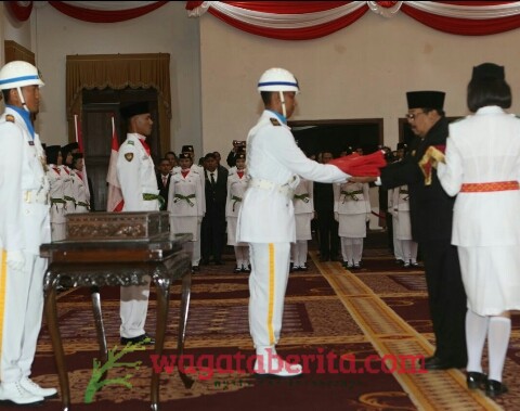 WAGATABERITA.COM – SURABAYA. Sebanyak 76 anggota Pasukan Pengibar Bendera Pusaka (Paskibraka) dikukuhkan oleh Gubernur Jawa Timur Dr. H Soekarwo di Gedung Negara Grahadi Surabaya, Selasa (15/08/2017) malam. Para anggota Paskibraka tersebut, akan bertugas dalam upacara HUT Kemerdekaan Republik Indonesia ke – 72 tingkat Jawa Timur di Halaman Gedung Negara Grahadi, Kamis 17 Agustus 2017.