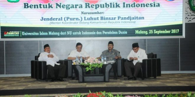 Wakil Gubernur Jatim Drs.H. Saifullah Yusuf Mendampingi Menteri Koordinator/Menko Bidang Kemaritiman RI Jenderal (Purn.) Luhut Binsar Pandjaitan Di Universitas Islam Malang (Unisma) Malang, Senin (25/09/2017). Sumber Foto : Humas Pemprov Jatim