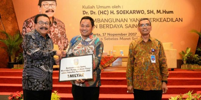 Dalam kesempatan ini, Gubernur Jatim juga memberikan bantuan kerjasama riset senilai Rp 1 miliar kepada Fakultas Pertanian UNS, serta memberikan bantuan pengolahan pupuk organik berupa 1 unit granulator dan 1 unit coper. (Haludin Ma’waledha)