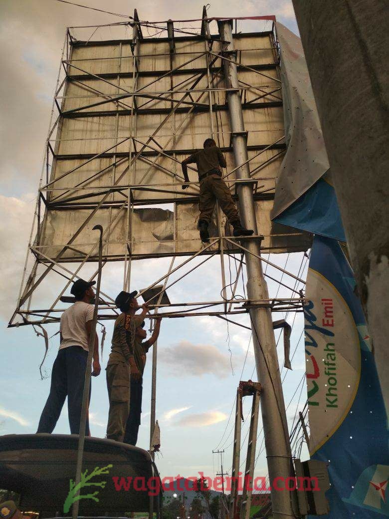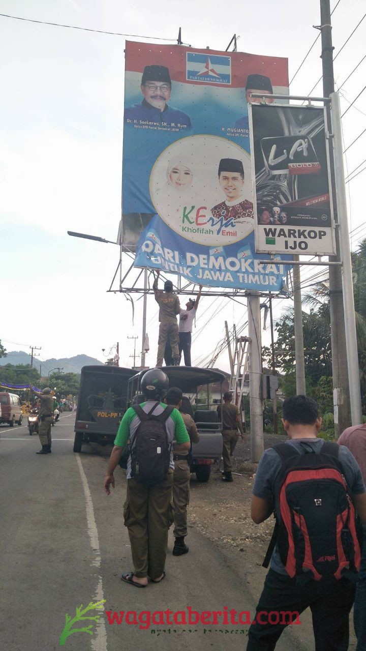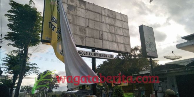 WAGATABERITA.COM – TRENGGALEK. Pemasangan baliho bergambar pasangan calon (paslon) Gubernur Jawa Timur dicopot oleh panitia Pengawas Pemilu Kabupaten Trenggalek. Pencopotan baliho tersebut dilakukan oleh Panwaskab dan Panwascam beserta Satpol PP dan pihak kepolisian.