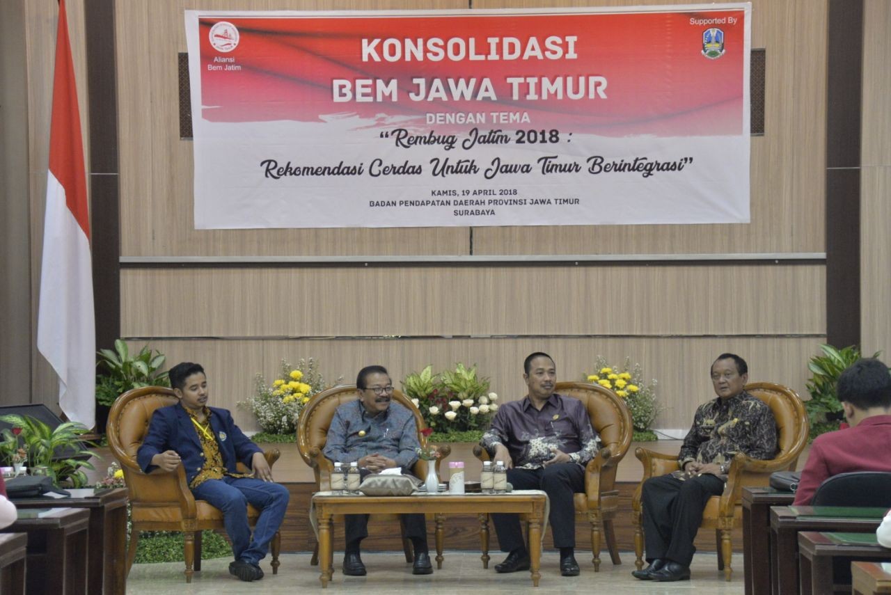 Hal tersebut disampaikan Gubernur Jawa Timur Dr. H. Soekarwo saat menghadiri Konsolidasi BEM Jawa Timur 2018 di Gedung Loka Arta Praja Kantor Bapenda Jatim Jl. Manyar Kertoarjo Surabaya, Kamis (19/04/2018).