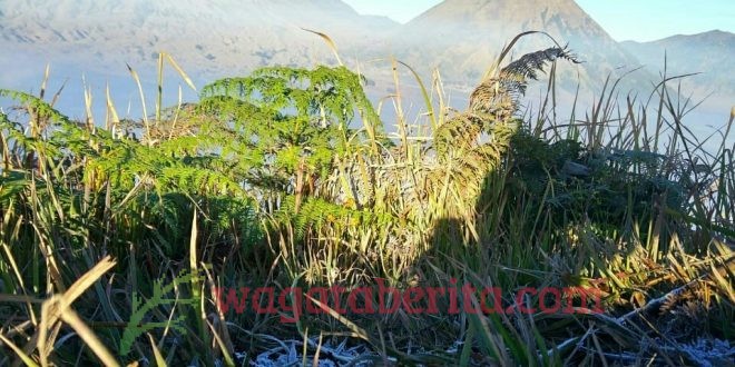 Sejak beberapa hari terakhir, sejumlah tanaman serta pasir di area Kaldera Gunung Bromo, membeku menyerupai butiran – butiran salju.