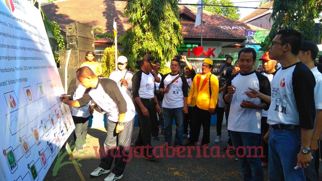 WAGATABERITA.COM – PROBOLINGGO. Bawaslu Kota Probolinggo bersama sejumlah perwakilan partai politik, melakukan Deklarasi Damai di gelar di depan gerbang masuk Alun – alun kota setempat, Minggu (23/09/2018).