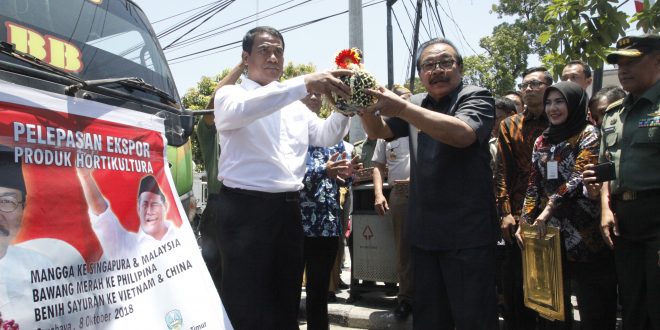 WAGATABERITA.COM – SURABAYA. Ekspor komoditi hortikultura kembali dilakukan Pemprov Jatim, terbukti kali ini Gubernur Jawa Timur Dr. H. Soekarwo bersama Menteri Pertanian RI Amran Sulaiman melepas ekspor tiga komoditas hortikultura Jatim di Dinas Pertanian Provinsi Jatim Jalan A. Yani, Surabaya, Senin (08/10/2018). Tiga produk hortikultura ini berupa buah Mangga, Bawang Merah, dan benih Kangkung akan diekspor ke Malaysia, Singapura, Filipina, Vietnam, dan China.