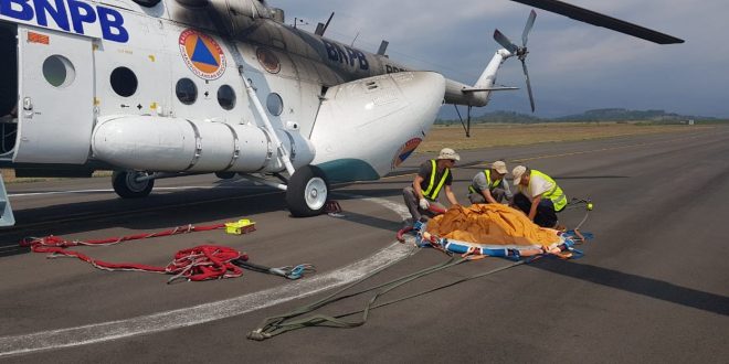 Petugas Heli Mi 8 BNPB melakukan persiapan Water Bombing.